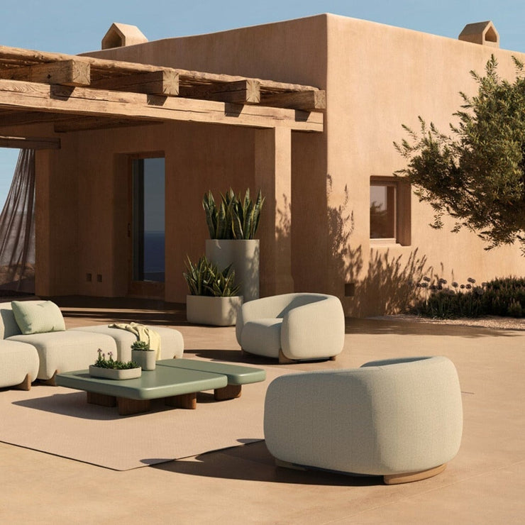 The inspiration behind Milos is nature, and Massaud has managed to reflect this through his choice of materials and varied textures. Wood and polyurethane make up the modular sofa and the two armchairs in different designs that invite you to sit back and relax. Light cement combines with wood to form the low tables, which together with the rotomolded planters, with a stucco finish, give a rustic aesthetic to the ensemble.